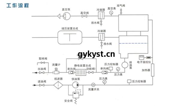 油(you)液(ye)在(zai)供(gong)油(you)泵的(de)作用(yong)下(xia)由進(jin)油口進(jin)入(ru)粗(cu)濾(lv)器,通過(guo)粗(cu)濾(lv)器除去(qu)油中(zhong)較(jiao)大(da)雜質(zhi)後經(jing)過(guo)加熱器時被(bei)加熱到55℃左(zuo)右(you),加熱後的(de)油液(ye)首先通過(guo)初(chu)級真(zhen)空罐內(nei)的(de)脫(tuo)氣元件(jian)噴射(she)到真(zhen)空罐內(nei),在真(zhen)空狀態下(xia),水(shui)份會(hui)低(di)溫(wen)沸騰而變(bian)成(cheng)水(shui)蒸氣,然後(hou)被真(zhen)空泵抽出,被抽(chou)出(chu)的(de)水(shui)蒸氣在通過(guo)冷凝(ning)器時大(da)部分被冷凝(ning)成(cheng)水(shui),小(xiao)部分透過(guo)真(zhen)空排氣口排(pai)出(chu)。